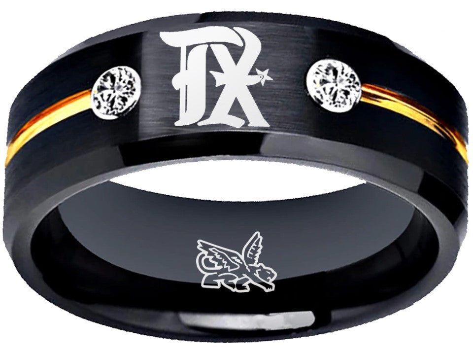 Capture the true essence of Texas Rangers fandom with our exquisite black and gold CZ Texas Rangers City Connect ring. Crafted with precision and passion, this stylish ring features the iconic team logo in striking silver against a sleek black backdrop. Made of durable tungsten, it symbolizes strength and everlasting commitment—a perfect representation of your love and loyalty. Personalize this ring with custom engravings, adding a touch of sentiment to commemorate your special day. Available in sizes 6-13, this exclusive wedding band is the ultimate choice for devoted Rangers fans looking to celebrate their love and team spirit in a truly unique way.