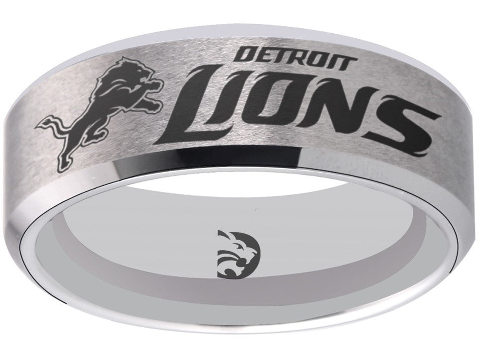 Capture the true essence of Detroit Lions fandom with our exquisite matte silver Detroit Lions Wedding Band. Crafted with precision and passion, this stylish ring features the iconic team logo in striking black against a sleek silver backdrop. Made of durable tungsten, it symbolizes strength and everlasting commitment—a perfect representation of your love and loyalty. Personalize this ring with custom engravings, adding a touch of sentiment to commemorate your gift.  Available in sizes 6-13, this exclusive wedding band is the ultimate choice for devoted Lions fans looking to celebrate their love and team spirit in a truly unique way.